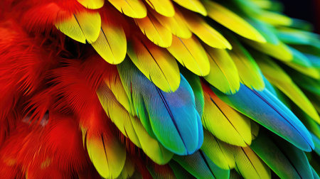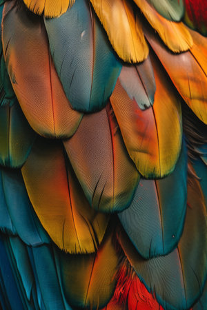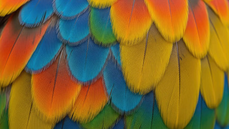 A stunning close-up of vibrant macaw feathers, showcasing nature's intricate patterns and a spectrum of colors