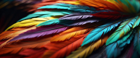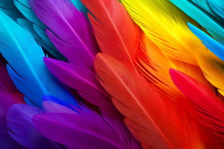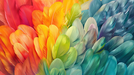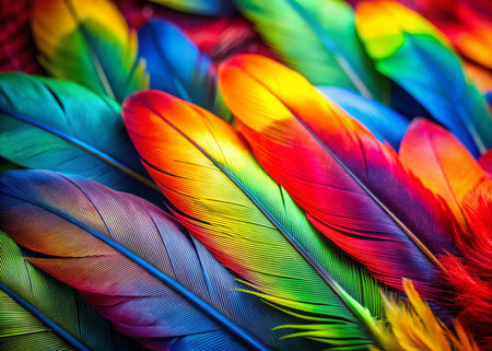 This image presents a close-up view of multiple feathers, exhibiting a rich spectrum of colors. The feathers display a variety of hues, including red, yellow, blue, and green. The artwork features a smooth texture and detailed composition, ideal for various design projects and commercial applications.