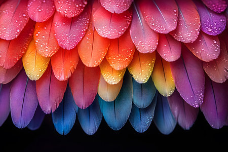 Vibrant feathers adorned with glimmering water drops creating a captivating natural scene