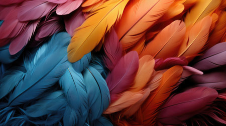 Abstract feather background. Colorful bird feathers close up. Exotic natural textured backdrop. Generative AI.