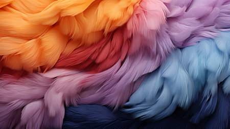 Generative AI, Beautiful rainbow colorful closeup feathers, photorealistic background, top view, aerial view. Small fluffy, inspired by Andreas Gursky and Andy Goldsworthy