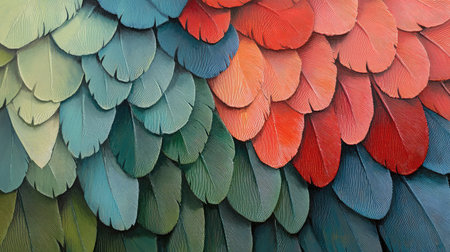 A stunning close-up of vibrant feathers showcasing a beautiful array of colors. The intricate patterns and textures highlight the natural beauty of wildlife.
