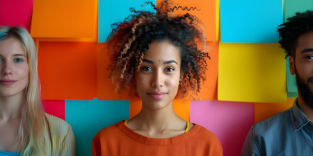 Joyful multicultural group of professionals stands against colorful mural image, ai generated. Colleagues dressed in stylish outfits photography scene. Vibrant work culture concept photorealistic