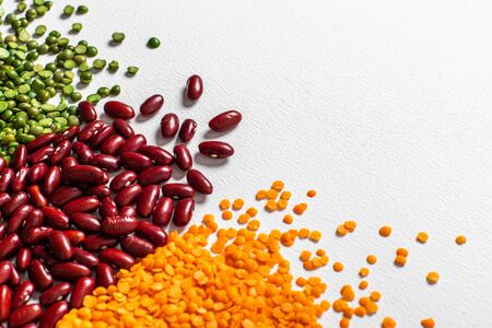 three types of legumes, beautifully laid out on a white background - red beans, green peas and orange lentils. Top view. copy space.. Vegetarian food. Unprepared.