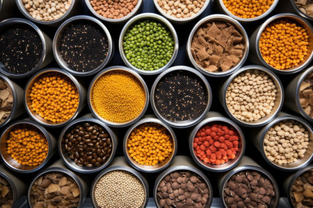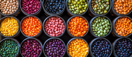 Variety of canned beans on a conveyor, vibrant colors, ready for packaging