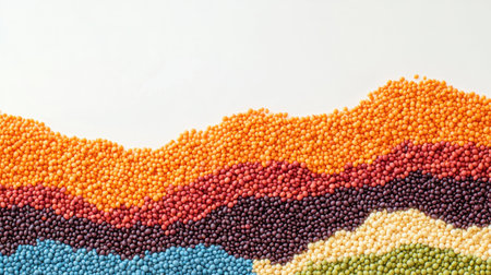 An array of colorful beans, lentils, and seeds is arranged in an abstract pattern, showing vibrant hues and textures meticulously combined.