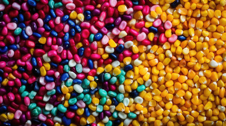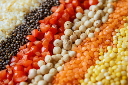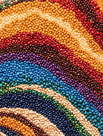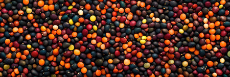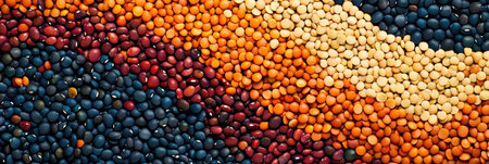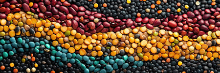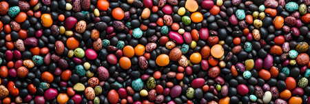 A vibrant arrangement of colorful beans, lentils, and seeds creates an intricate abstract pattern that showcases nature's diversity.