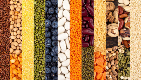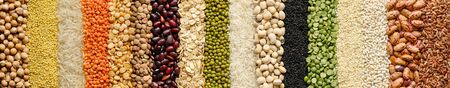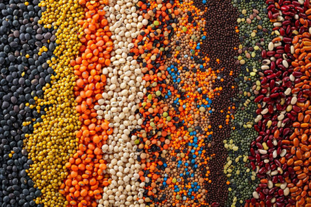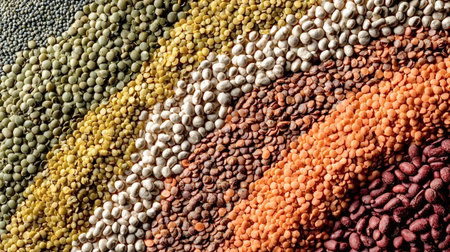 Assorted colorful legumes and pulseslentils, beans, chickpeas and peasarranged diagonally in stripes, showcasing textured, healthy, plant based ingredients for cooking