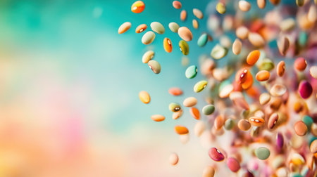 A vibrant array of colorful candy coated confections cascades against a soft focus pastel background, creating a joyful and playful scene filled with sweetness.