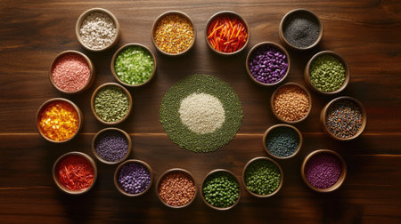 A stunning display features a variety of spices and lentils arranged in bowls on a wooden table. The vibrant colors and textures create an inspiring culinary scene perfect for cooking enthusiasts.