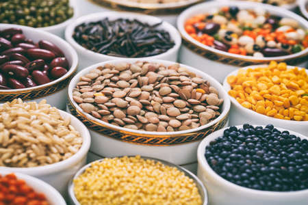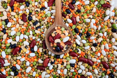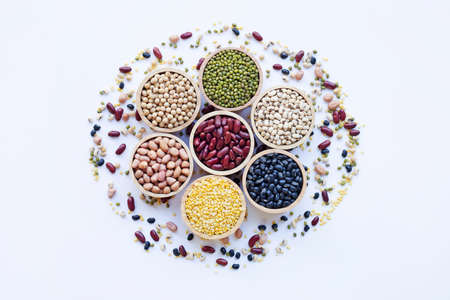 Collage various mix beans peas agriculture of natural healthy food for cooking ingredients / different whole grains mixed beans and legumes seeds lentils and nuts colorful snack , selective focus