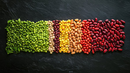 A vibrant display of bean varieties, from green mung beans to red kidney beans, arranged in a rainbow pattern on a dark slate background