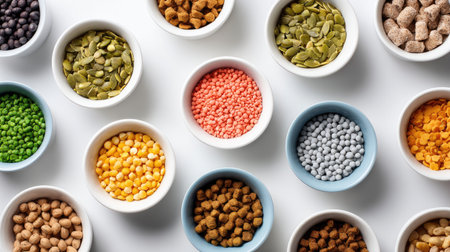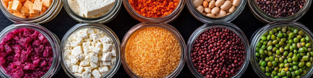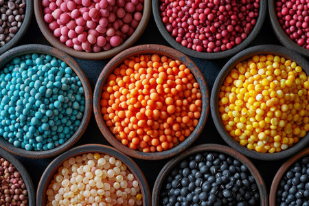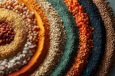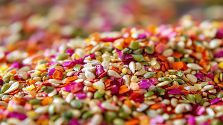 This vibrant image features an arrangement of assorted seeds and grains in various colors, showcasing their natural beauty and nutritional value. Perfect for food and health-related themes.