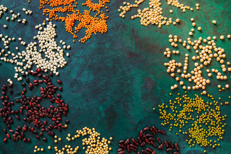 Healthy food theme background concept. Frame of scattered beans on emerald green background with round copy space in middle. Top view, flat lay. Superfoods are red and white haricot, chickpeas, lentils, mung bean, soya.