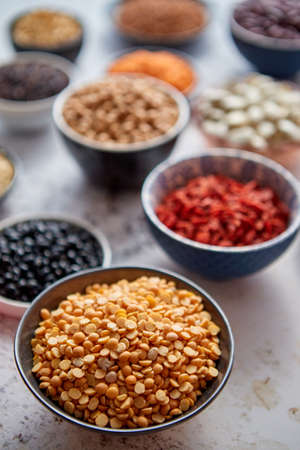 Legumes and beans assortment in different bowls on light stone background . Top view. Healthy vegan protein food.