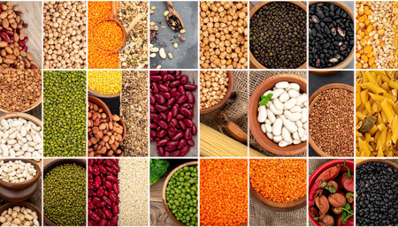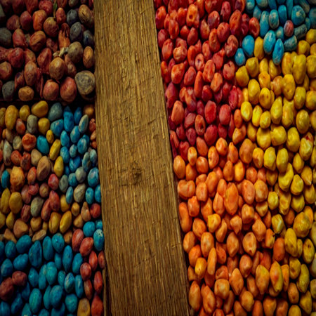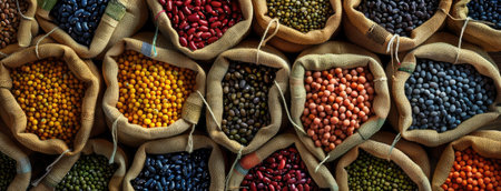 An intricate arrangement of various beans, lentils, and seeds in vibrant colors, showing artistic patterns and textures.