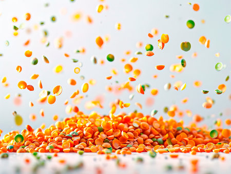 Red lentils isolated on white, top view photography of LENTILS falling from the sky, hyperpop color scheme. glossy, white background