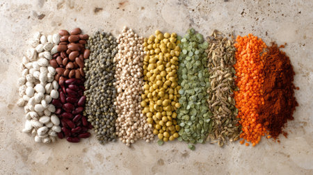 A vibrant display of assorted dried beans and lentils arranged in an appealing line on a textured stone surface, highlighting their diverse colors and shapes.