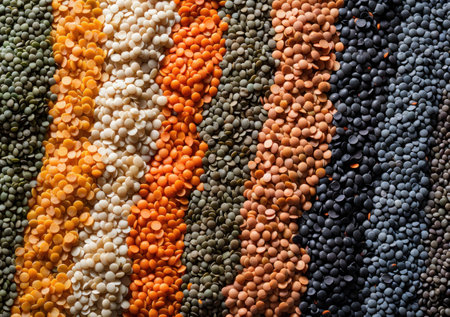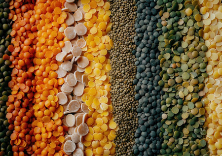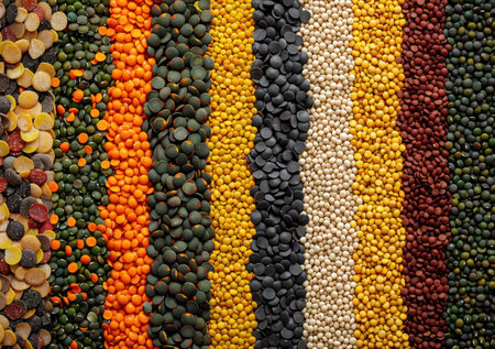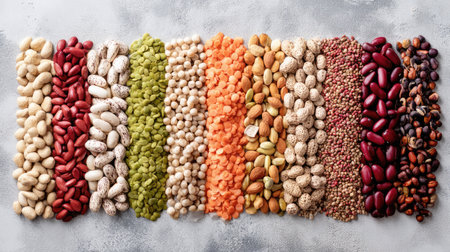 Colorful assortment of various legumes and lentils arranged in rows, showcasing diverse textures and shades. Healthy eating and natural food concept.