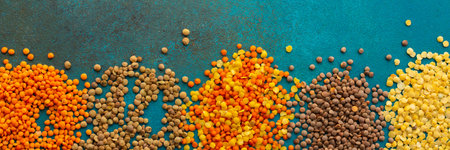 Multi-colored lentils on an emerald green background, scattered yellow and brown, green and orange lentils, healthy legumes banner, top view