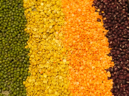 Colorful arrangement of different lentils and legumes in vibrant hues of yellow, green, and orange on a textured surface