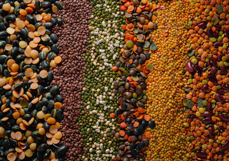 A vibrant arrangement of beans, lentils, and seeds showcases an abstract pattern in assorted colors and textures, creating visual interest.