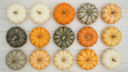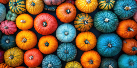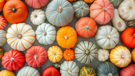 Thanksgiving and Harvest Festival. variety of pumpkins, their vibrant colors and textures ranging from smooth orange to warty green, representing the diversity of natures gifts.