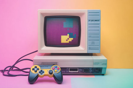 Classic gaming console stands on a vibrant surface with a controller ready, evoking nostalgia for retro gaming experiences and fun.