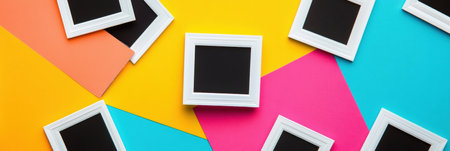 Colorful flat surface features scattered white polaroid frames arranged with open space for personal memories and creative expression in a fun setting.