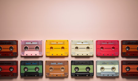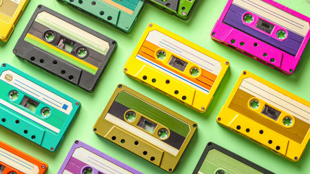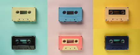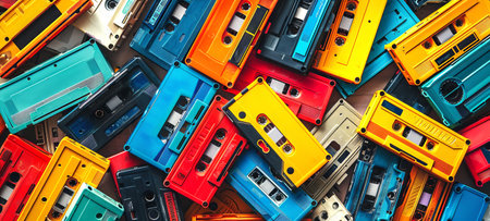 Retro cassette tapes in an array of vivid hues. Top view. Background. Concept of vintage music, collectible items, the 80s and 90s culture, and the charm of physical media. Banner