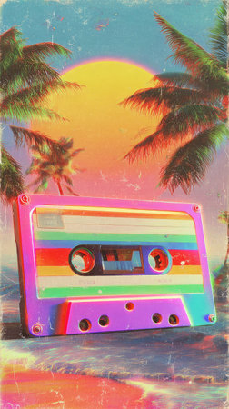 This colorful illustration features a retro cassette tape set against a vibrant sunset and palm trees. The composition includes a vintage aesthetic with a soft focus and textured effects. The image evokes a nostalgic feeling, suitable for design projects, editorial use, or commercial purposes such as marketing materials.