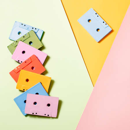 Old colorful cassette audio tape on pastel color background, and leave blank space above for text input