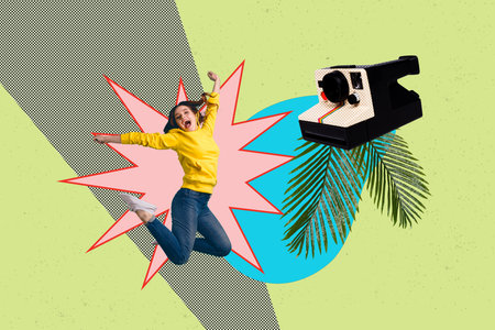 Image zine trend photo collage of happy girl guy pose retro camera cadre shooting paparazzi photo-zone flash optical device
