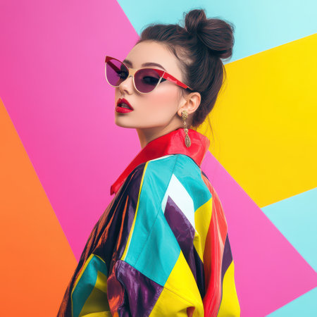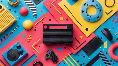 A vibrant retro boombox set against a colorful background featuring bright yellow and pink papers, perfect for nostalgic themes in various creative projects.