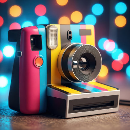 A vibrant retro instant camera in eye-catching pink yellow and blue stripes sits against a backdrop of soft, out-of-focus colorful bokeh lights, evoking nostalgia and creativity.