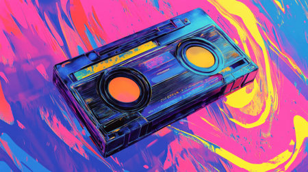 A vivid retro cassette tape featuring bold colors and dynamic abstract patterns, ideal for representing nostalgia, music culture, or vibrant artistic themes.