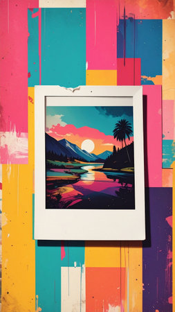 Scattered white Polaroid frames on a vibrant flat surface create an engaging space for personal memories and artistic expression amid colorful backdrops.