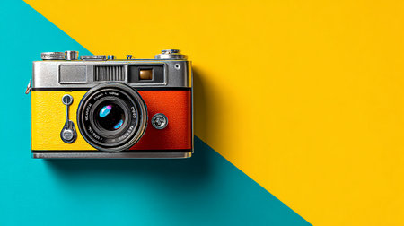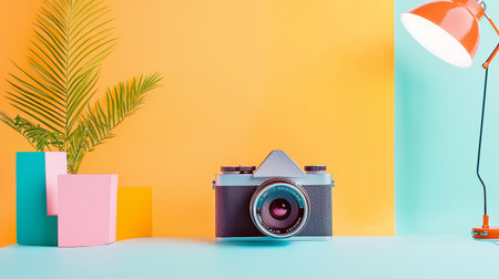 A retro-style camera displayed with pastel decor and a vibrant orange and teal background. Minimalist and creative visual composition.