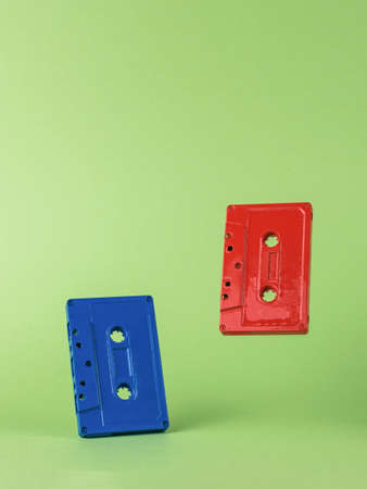 Falling red and blue tape cassettes on a green background. Vintage style in sound recording. flat lay.