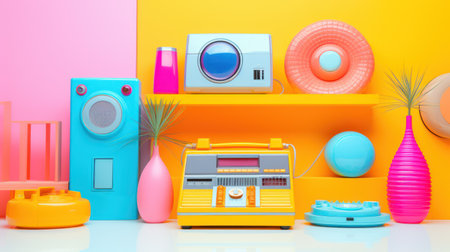 Collage of colorful objects, including camera, fruit, and other items. Graphic effects with bright colors, retro style, inspired by the 90's. Generative AI.