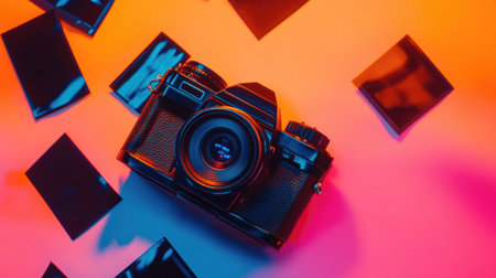 This stunning image showcases a vintage camera surrounded by film negatives on a vibrant orange and pink background, perfect for creative projects.
