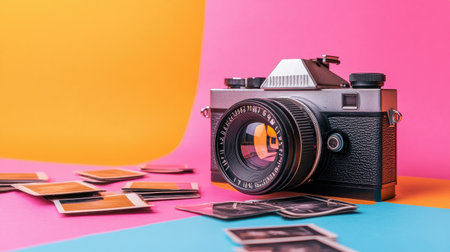 A vintage camera positioned centrally on a colorful background, surrounded by film negatives. This image captures the essence of photography, ideal for creatives and enthusiasts.