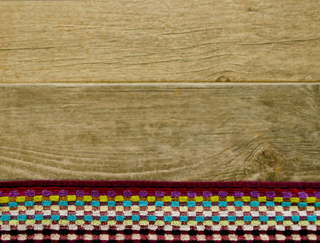 Top view of a colorful towel on a wooden floor with grain