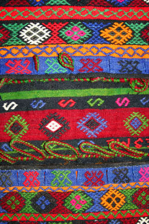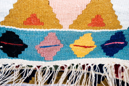 Traditional Albanian bright colorful woolen woven pattern rug handmade in the street market, close up.