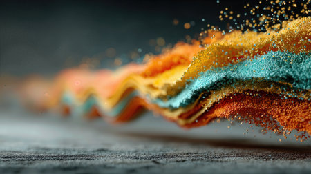 A wave of colorful sands ripples across a surface, showcasing shades of blue, orange, yellow, and green. The fine granules blend seamlessly, inviting creativity and exploration.