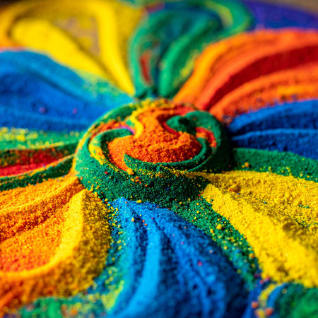A mesmerizing spiral of vibrant colored powders radiates outward, capturing the joyful spirit of creation and celebration.