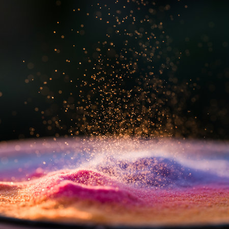 An enchanting display of colorful sand particles resembling a wave, illuminated by soft sunset light, creates a magical and artistic atmosphere.