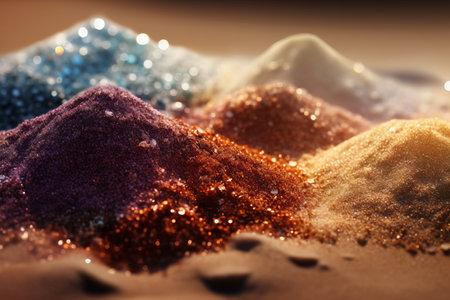 Intricate mounds of colorful powder create a stunning visual against a dark backdrop, showcasing the beauty of texture and vibrant hues for artistic inspiration.