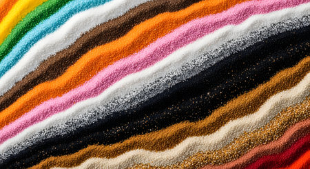 A vibrant, abstract background composed of wavy diagonal layers of colorful sand. The granular texture is visible in each distinct color, including rainbow hues, black, white, and brown. This image represents diversity, creativity, layers, and can be used as a dynamic, textured wallpaper.