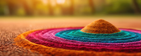 A stunning display of vibrant colored sand creates an abstract pattern, illuminated by soft light. This exquisite composition showcases creativity and texture, ideal for artistic projects or backgrounds.